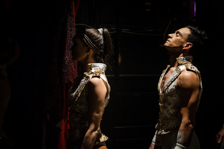 Les photos d’une rare intensité manifestent sa présence efficace et silencieuse en coulisses, présence démarrée il y a une douzaine d’années. Elles nous montrent la permanence des habitudes et rituels afin de conjurer l’inquiétude et être dans l’excellence une fois le rideau franchi.